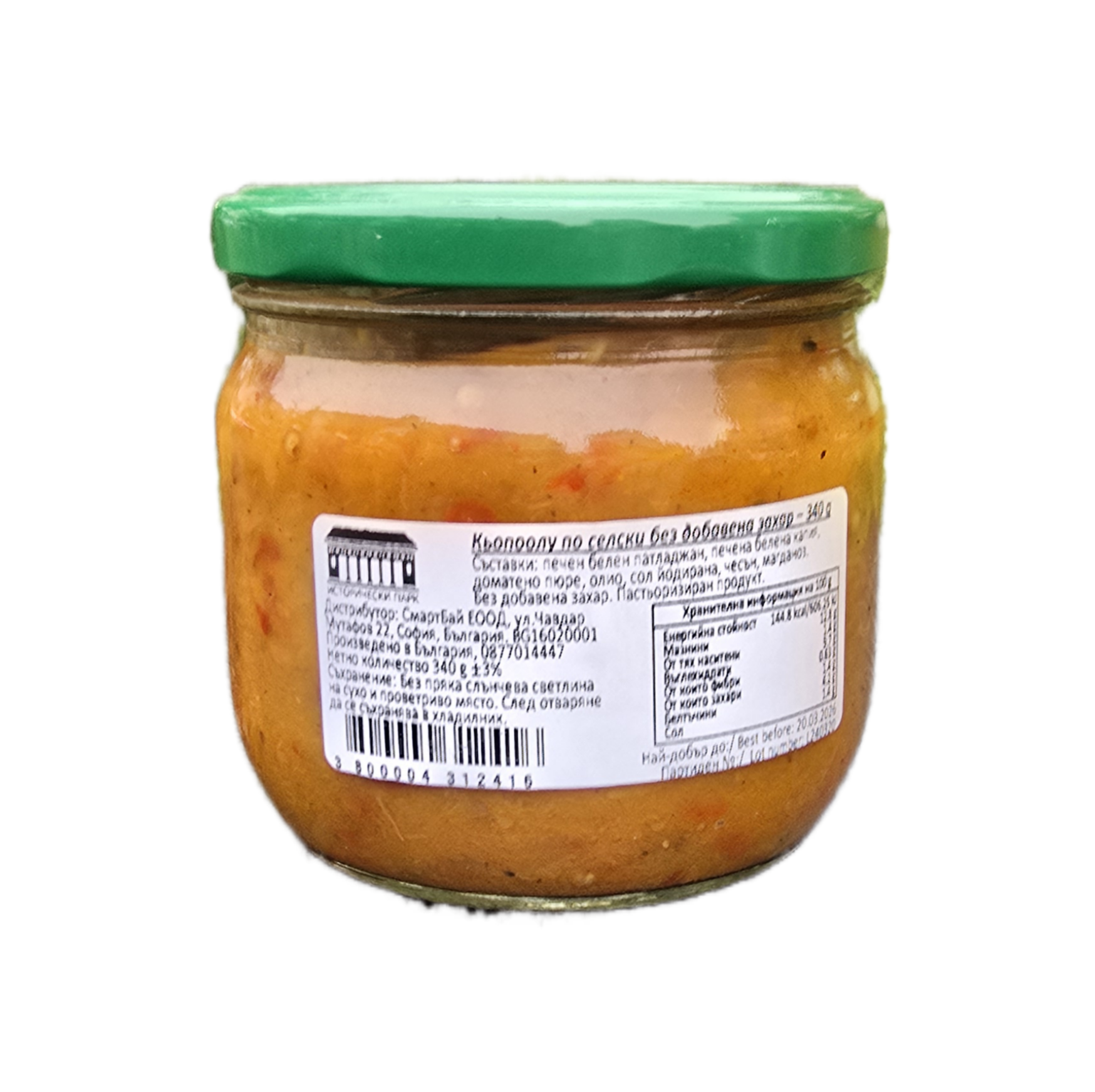 Кьопоолу по селски без добавена захар, произведено за Исторически парк. Състав: Печен белен патладжан, печена белена капия, пюре от домат, олио, сол, магданоз, чесън за аромат.